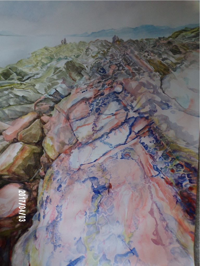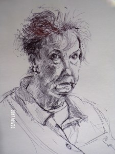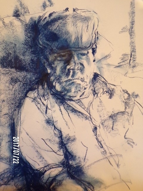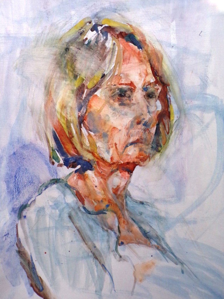 During the lockdowns of 2020 and now 2021, I sought solace in my art practice and have used the spare time to experiment significantly with media. Whilst fortunate to stay safe in terms of my own health and that of most of my immediate family, (I am just about to have my jab), my husband was hospitalised 3 times in 2020 with a respiratory condition, though this wasn’t COVID-19. Keeping an eye on the main news, I have turned away from the seriously scary issues, wanting nourishment rather than pressure. (I am glad to say my husband is now stable). Consequently, my subject matter became still life objects and flowers and a blackbirds’ nest, and the allotments at Fletchertown, all comforting areas of exploration. Armed with more brushes I am progressing my oil painting, and intend relating to ’ 2021, The International Year of Fruit and Vegetables.’ Previously, I identified more as a figurative artist, but with no life models recently available, I was left with portraiture, and thus have drawn both myself and my husband. I am looking very gloomy – in the first ever portrait of myself. My endeavours have been supported by the members of the West Cumbrian branch of the Eden Valley Artistic Network. During the break between the 2020 lockdowns, Brian and I, and Tiger the terrier, managed a short holiday break with our caravan, but all the galleries were shut, and my efforts were limited then to my sketch books, which with photographs, I always maintain.