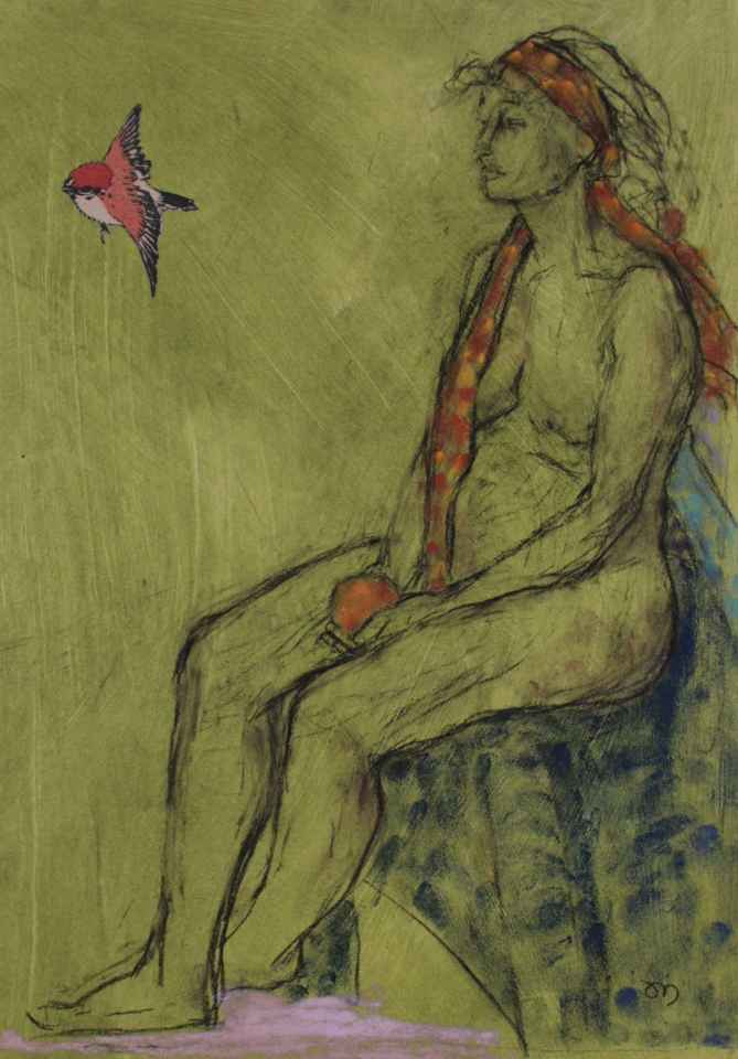 figure with orange and Hokusai sparrow lr 2313 ← Previous Next → “Hokusai sparrow”; carbon pencil, pastel, collage on acrylic ground
